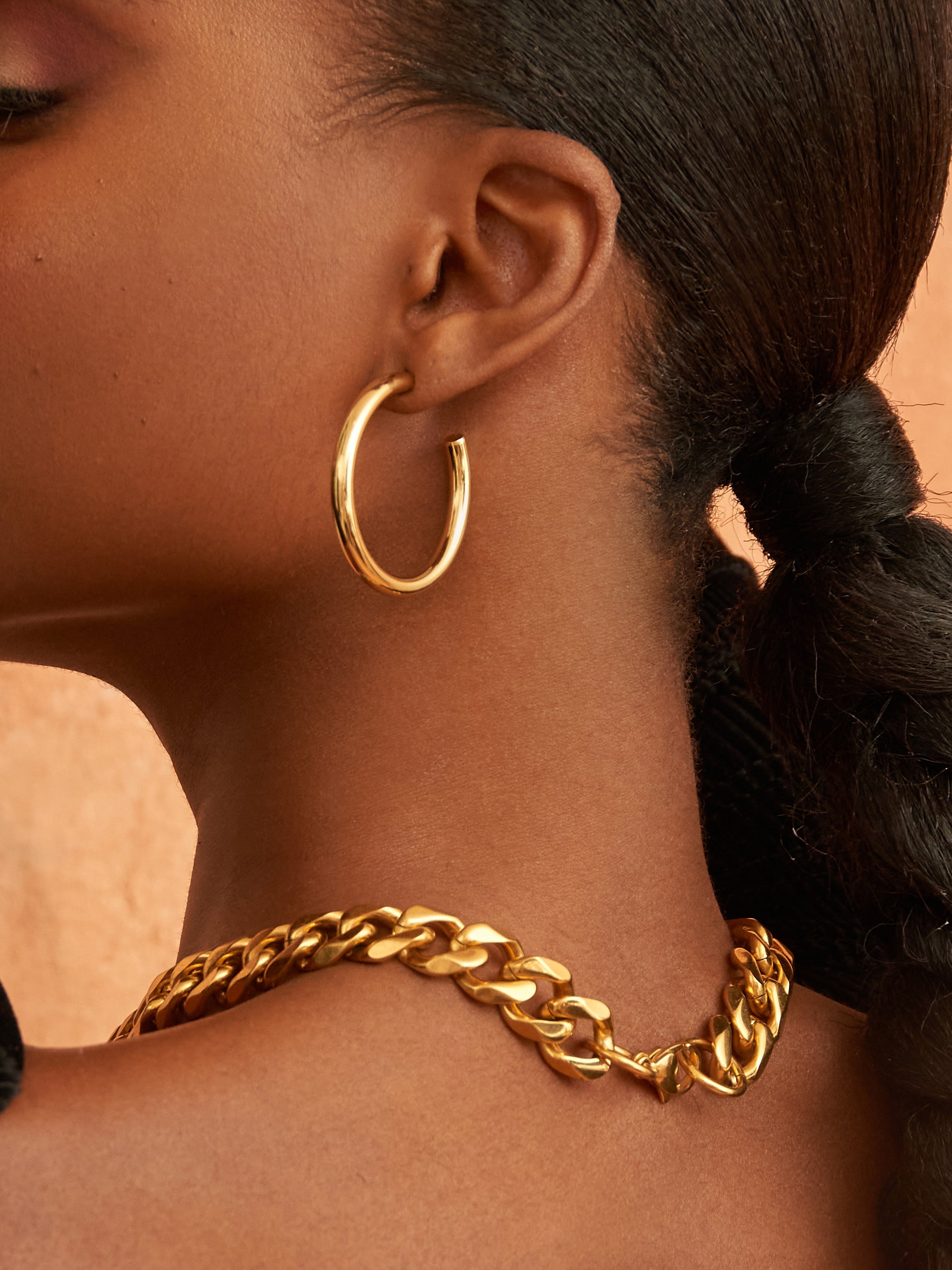 The Liv hoops offer a modern take on an all-time classic and every girl's must-have accessory. Slightly slimmer than our bestselling Bente hoops, they still feature the same sleek, polished finish and versatile style. Chic and timeless, these gold-plated hoops add a touch of elegance to any look. Available in various sizes, they are perfect for different moods and occasions, making them a versatile addition to any jewelry collection.