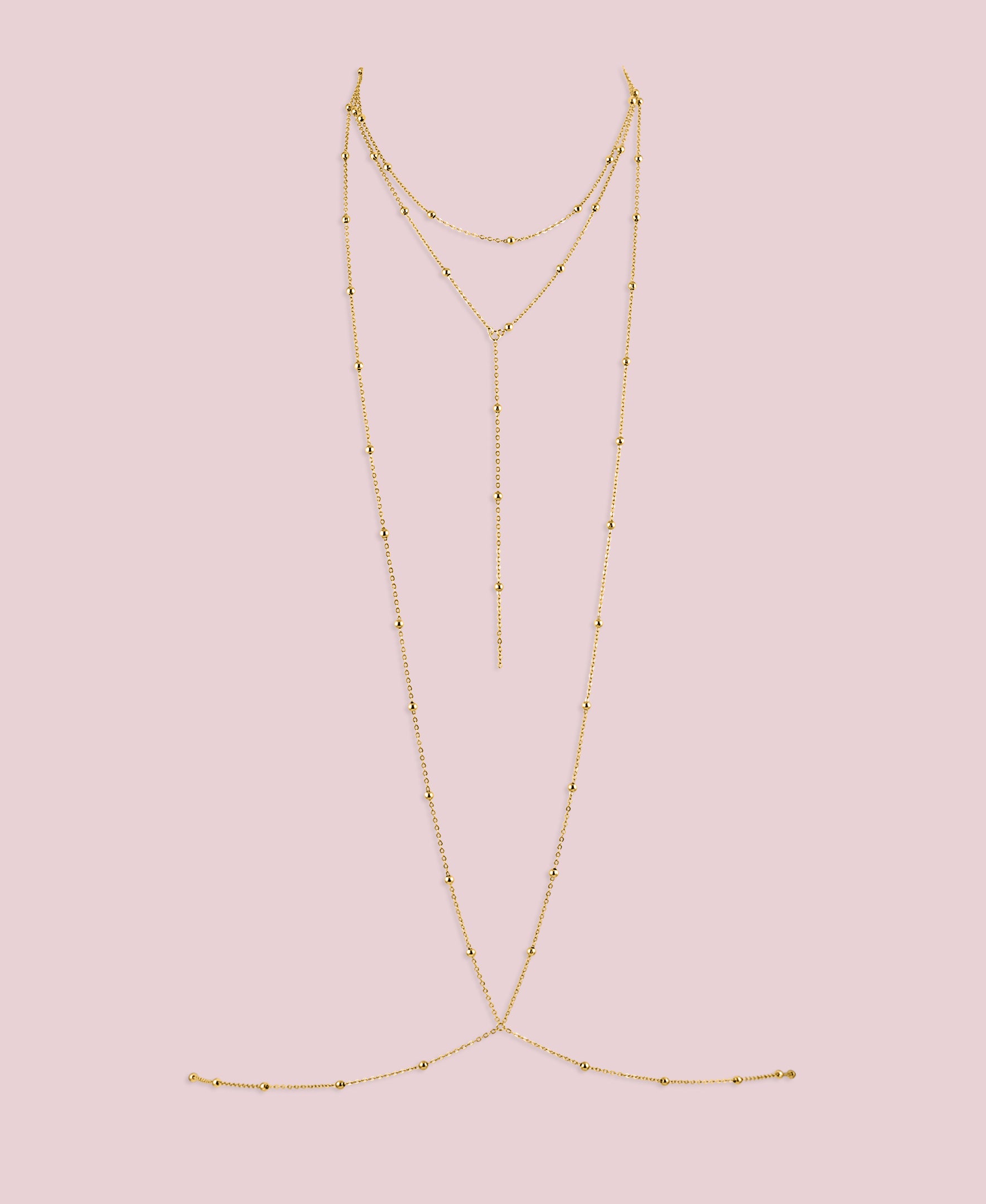 The Wahala Body Chain features a choker detail, dainty chain, and beads, inspired by our beloved Emina chain. Available in 18k gold-plated brass, this piece is both luxurious and durable. The chain measures 16" around the neck, with a 17" drop from the neck chain to the waist chain, and the waist chain measures 37". With adjustable chains, it ensures a perfect fit for any body type.