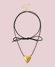 This timeless heart shaped necklace comes with a twist, you can mix and match with the black and white colored wax cords, or combine the wax cords with the gold chain, or wear it alone, whatever matches your mood. It has a shiny finish and matches perfectly with the Okan earrings to the look.
